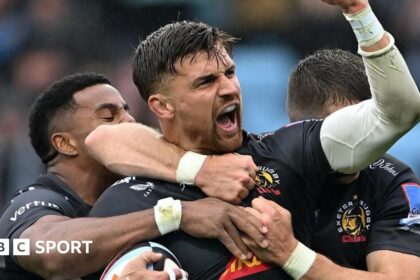 Exeter: Hodge; Feyi-Waboso, Slade, Ikitau, Woodburn; Skinner, Varney; Goodrick-Clarke, Dweba, Iosefa-Scot, Jenkins (capt), Tuima, Hooper, Roots, Fisilau. Replacements: Yeandle, Burger, Tchubadze, Zamb...