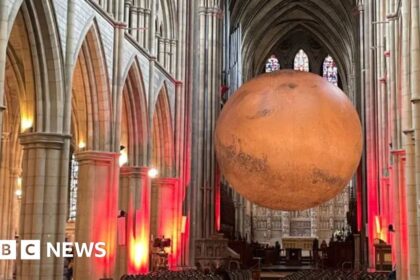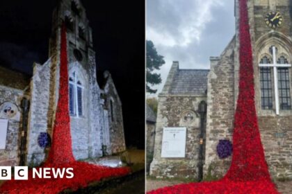 Thousands of knitted poppies have been draped from the bell tower of a church to commemorate Remembrance Sunday. The display at Holy Trinity Church in Tresillian, Cornwall, was carefully attached to t...