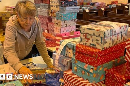 Caroline Robinson,Devon and Hattie McCann,Devon BBC Volunteers packed and checked the boxes Five-hundred shoeboxes have been filled with Christmas presents for children in Eastern European countries. ...