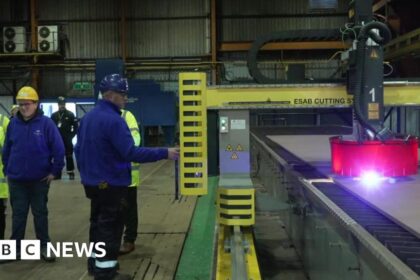 BBC The bow sections of the ships are being built in Appledore, north Devon A steel cutting ceremony has been held to mark the start of construction of a new modern support ship for the Royal Navy. Th...