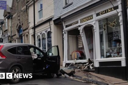 A business owner says she is “shocked and sad” after a 300-year-old property was damaged in a car crash. Devon and Cornwall Police said the car crashed into a home furnishings shop on Fore...