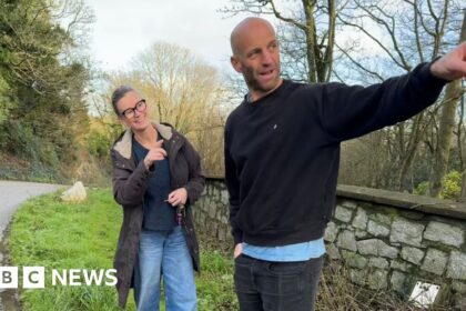 Christine ButlerBBC News Cornwall BBC Anita Duffy and Emile Kott are concerned about the dangers of living in a village with no pavements and 60mph speed limits Villagers are campaigning for a 30mph s...