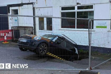 An empty parked car has fallen into a sinkhole. The Mini car fell into a hole about 2m (6.6ft) deep on Sunday in a car park behind Berrymans Bakery on Trew Parc, in Redruth, Cornwall. Cornwall Council...