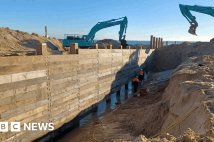 Work has begun on the next stage of a two-year coastal defence project. Photos have been released showing how engineers are replacing two existing timber groynes at the beach below East Cliff in Bourn...