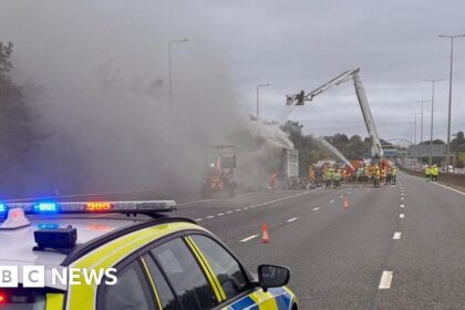A lorry fire has forced the closure of part of the M5 in Devon. The fire broke out on the northbound side of the motorway between junctions 30 and 29 in Exeter at about 11:35 BST, said Devon and Somer...