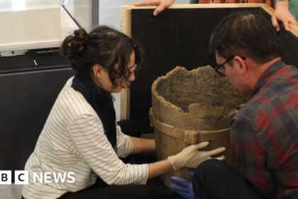 An urn which dates back more than 3,000 years to the Bronze Age has gone on display. The ceramic vessel is on loan from Exeter’s Royal Albert Memorial Museum and Art Gallery and is in Newton Abb...