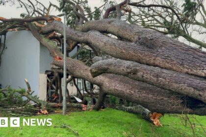 Lisa Young,Cornwalland Tamsin Melville,Cornwall BBC Emily Hotchkiss said she and her two children had been “inches from death” when the tree fell on their house A family remains in tempora...