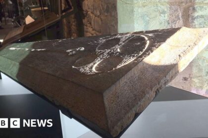 Patrick Hughesand Charlotte Andrews,South of England BBC The two Purbeck grave slabs, from the 13th Century, are thought to be the first of their kind ever found in a shipwreck A grave slab raised fro...