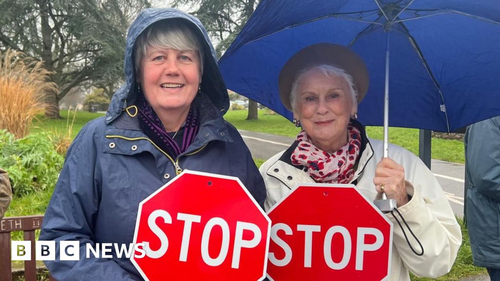 BBC A picture of two ladies holding a sign each. It is red signs with the word STOP on it.BBC