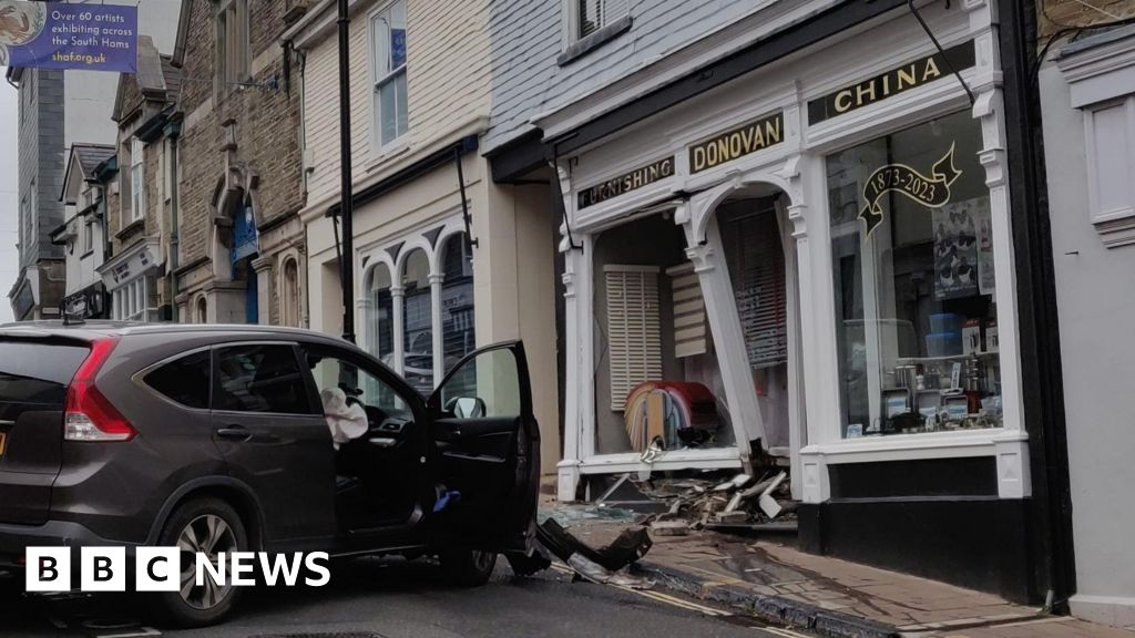 Devon and Cornwall Police said the car crashed into a home furnishings shop on Fore Street, Kingsbridge, at about 15:25 GMT on Sunday.