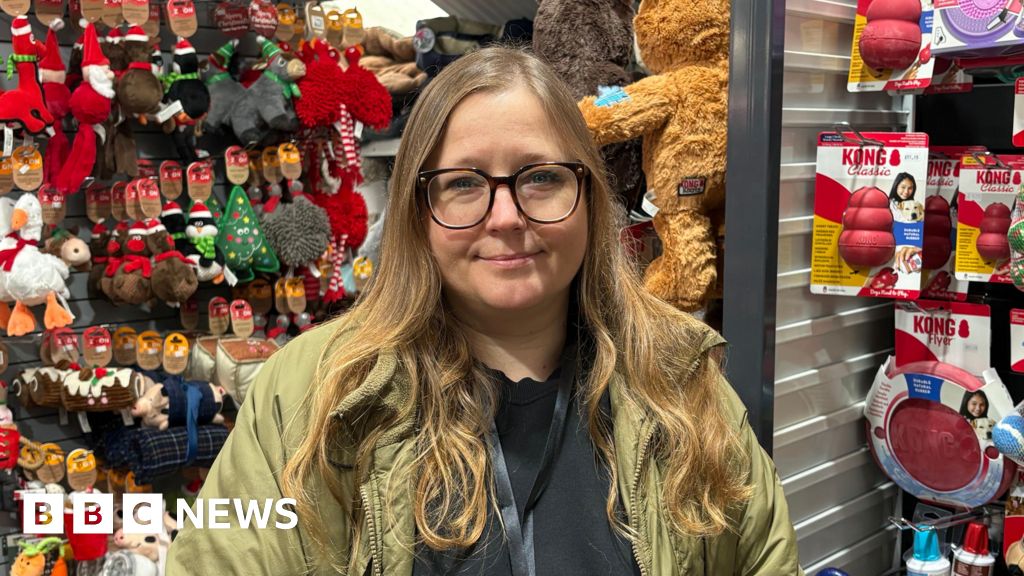 BBC Anna has long light brown hair and wears a light green jacket and black top. She stands in front of a display of Christmas related toys in a shop. BBC