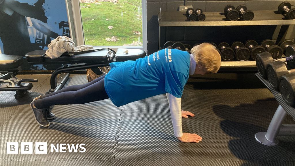 BBC The photo is taken in a gym. Dorrie is doing a plank with perfect form. She is wearing navy leggings and a blue T-shirt. There are racks of dumbbells of different sizes in the background.BBC