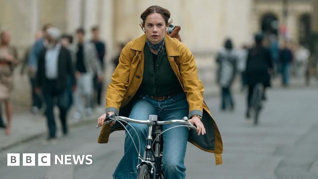 Apple TV Ruth Wilson is wearing a yellow coat and blue jeans, while cycling down a road, She's looking concerned. In the background is several people walking around, all blurred out.Apple TV