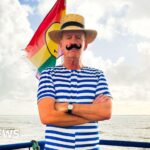 The Box A sailor sculpture in the style of Beryl Cook's paintings sits with his arms crossed. He's wearing a white hat and is smiling. The Box