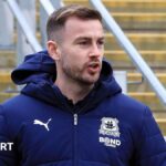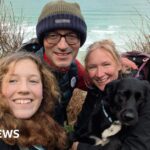 BBC The picture shows an aerial view of a small town surrounded by rolling green hills and countryside. In the foreground, there is a calm river running horizontally across the bottom of the image, with a few small boats moored along its edge and a line of trees bordering the water. Behind the river, there are rows of houses and buildings packed closely together, forming a dense residential area. The houses are mostly two-storey, painted in light colours such as white, cream, and pastel shades, with sloping roofs.BBC