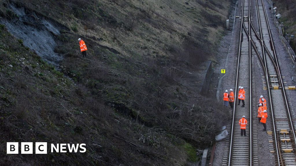 Getty Images A grassy slope to the left of the image has experienced a landslip, and a  large patch of earth has apparently slid down the hill and encroached on a railway line that can be seen to the right. On the line, a group of railway engineers wearing orange high-visibility jackets and white hard hats are stood around inspecting the damage. A solo engineer can be seen on the slop itself, stood right at the top of the patch of earth that has suffered the slip.