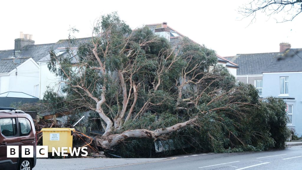 PA Media A picture of a tree fallen on top of a house. It is a large tree with a bin and car pictured next to it.PA Media