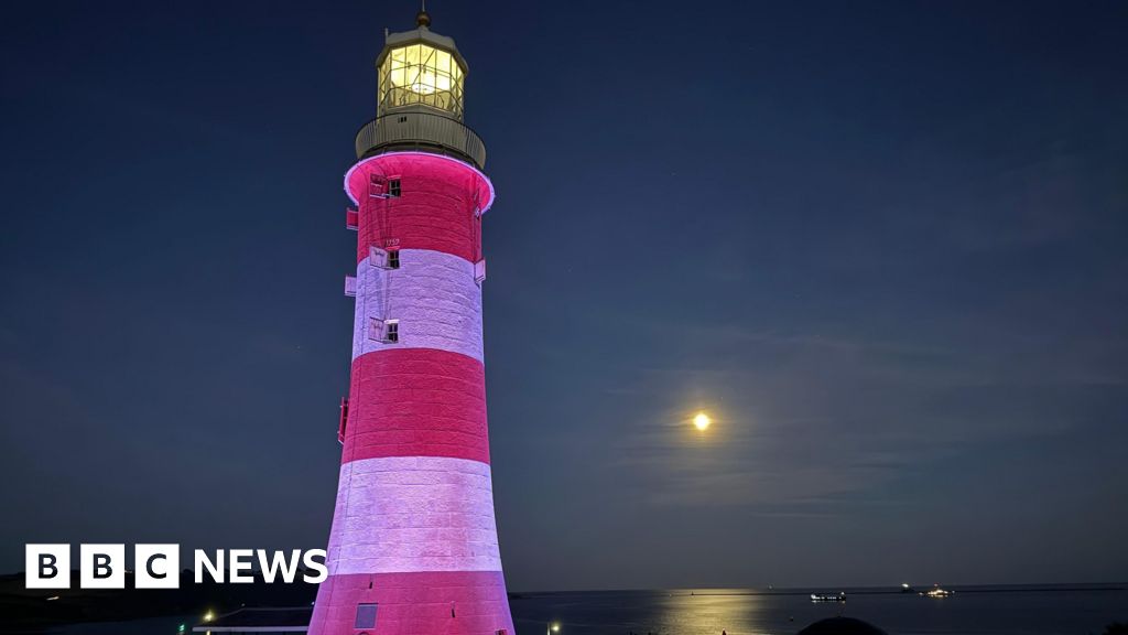 BBC A picture of the lighthouse on Plymouth Hoe. It is red and white in colour, and there is the moon in the distance.BBC