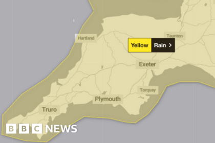 A yellow weather warning for rain covering the south west has been issued by the Met Office. The warning, affecting Cornwall and Devon, has been put in place from 15:00 GMT on Monday until 12:00 on Tu...
