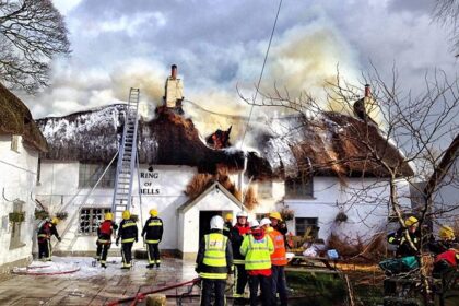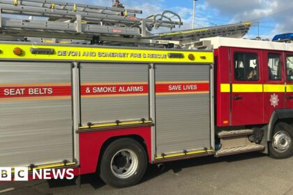 Two dogs were rescued from a blaze at a static home in south-west England, firefighters said. Devon and Somerset Fire Service said it was called to the incident near the A361 in Ash Mill, near Knowsto...