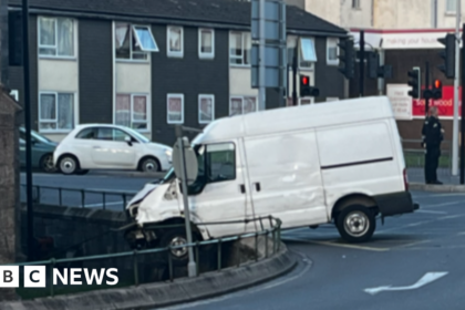 BBC He drove on the wrong side of roads and mounted pavements A man has been jailed and banned from driving after he crashed a stolen delivery van into barriers around a historic church. Reece Rowe, 2...