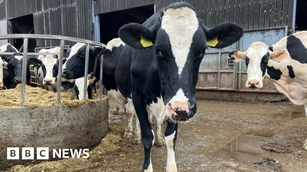 BBC A Holstein is looking at the camera in the middle of the photo and another is standing slightly father back and is also looking at the camera. Three other cows are standing around a feeder and they are also looking at the camera. They are all standing in front of a barn in a yard.BBC