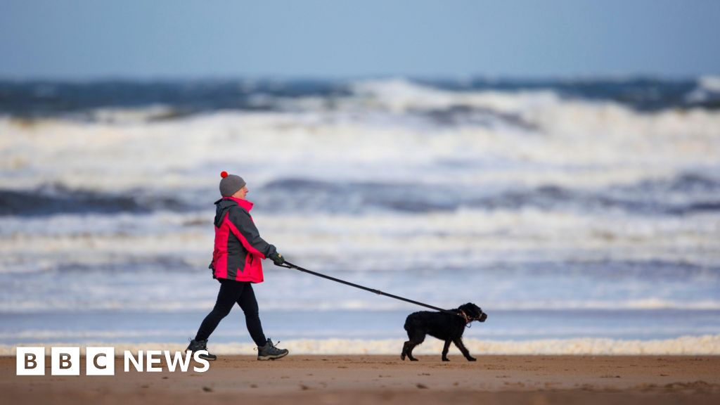 BBC A man wearing a red coat, hat, black trousers and walking boots, walks along a sandy beach. He is walking a black dog. He is using one hand to hold the lead which is stretched out in front of him. Waves are crashing in the background.BBC