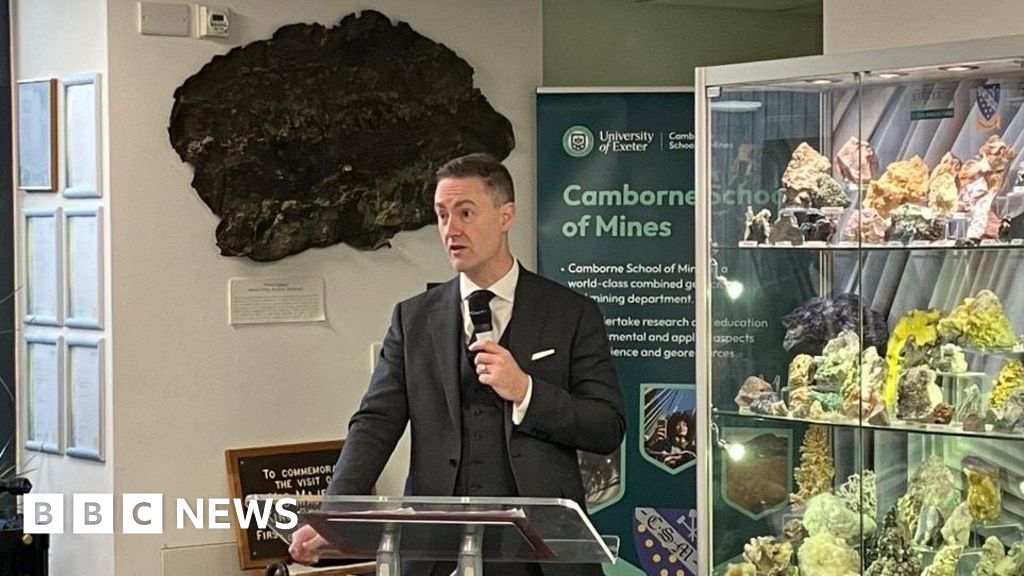 BBC Industry Minister Chris McDonald talks into a microphone while stood at a lectern in front of a cabinet of minerals at the Camborne School of Mines. McDonald is wearing a black suite with a white shirt.BBC