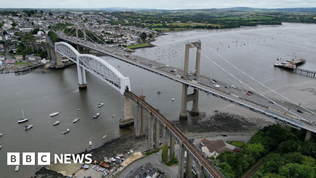 BBC The photo shows an aerial view of the Tamar Bridge, a suspension bridge over the River Tamar. Next to it is a rail crossing. Houses and green fields are seen in the distance. BBC