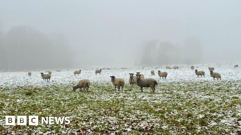 Anne A field of sheep with a light dusting of snow on the grass.Anne