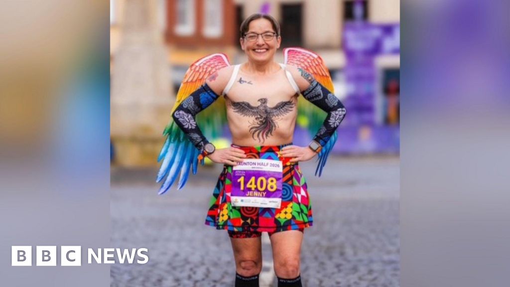Jenny Palmer ran the race topless after having a total mastectomy following a breast cancer diagnosis.