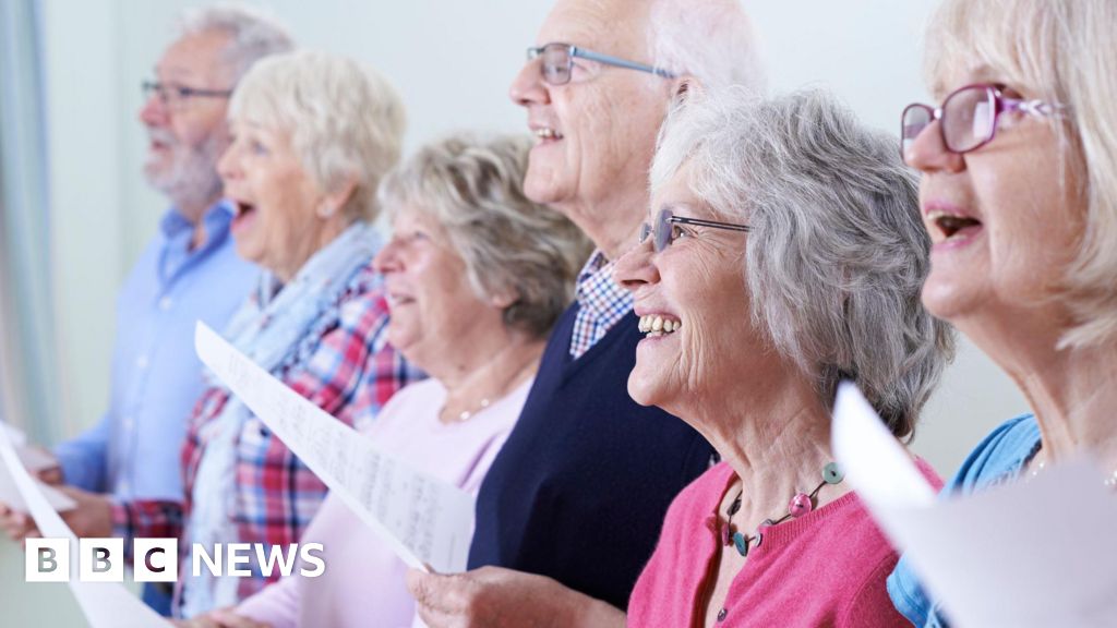 Getty Images A group of six elderly people - four women and two men - standing in a line and singing from a choir lyrics sheet. They are standing in a brightly lit room, smiling and looking off to the left of the camera.Getty Images